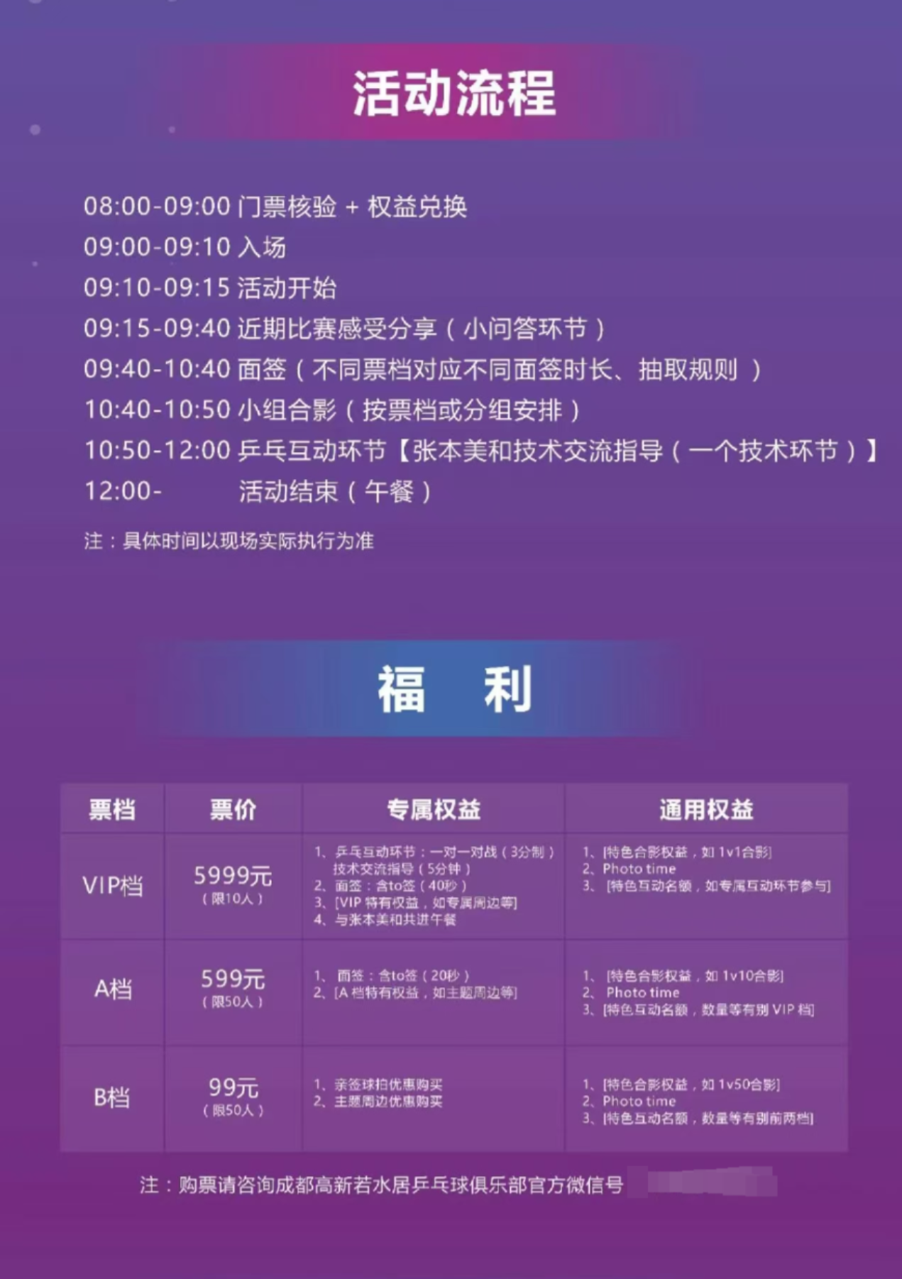 5999元的票价有哪些权益?封面新闻记者致电成都高新若水居乒乓球俱乐部,工作人员介绍,5999元档活动包含599元档的所有内容,此外还额外增加了与张本美和一起打球和共进餐食的环节。其中,“打球”环节时间较为有限,大约有三次击球互动机会,同时还有5分钟技术交流指导。
